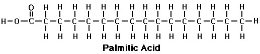 Long chain fatty acids were examples diagrammed above (e.g. stearic acid: an abundant energy source, known as “diesel fuel” for the body. Where do you find this fat? Beef. Human breast milk. Oh yes, and chocolate) and below is palmitic acid, a very common fatty acid, with antioxidant effects in the body. Found in high concentrations in palm, coconut and yes, chocolate.
