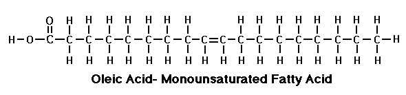 Monounsaturated oleic acid (18 carbons, 1 double carbon bond, 2 missing hydrogen)