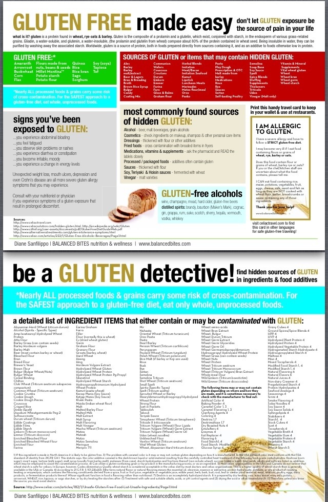 Very few people need to completely avoid wheat and gluten but nearly everyone I’ve come across feels, looks and performs better by limiting their exposure to it. Mostly found in “food products”, wheat and/or gluten is becoming a universal ingredient added to prepared and processed food and is almost everywhere these days. That being said, if you are trying to limit your exposure it can be quite challenging to know where it’s hiding and if, in the case of gluten, it’s masquerading as something else. You literally must become a gluten detective. Spotting wheat in an ingredient list is easy but finding other sources is pretty challenging. Step in the Gluten Guide from Balanced Bites. Nearly everything you ever wanted to know about being Gluten Free or a Gluten Detective is in this PDF: