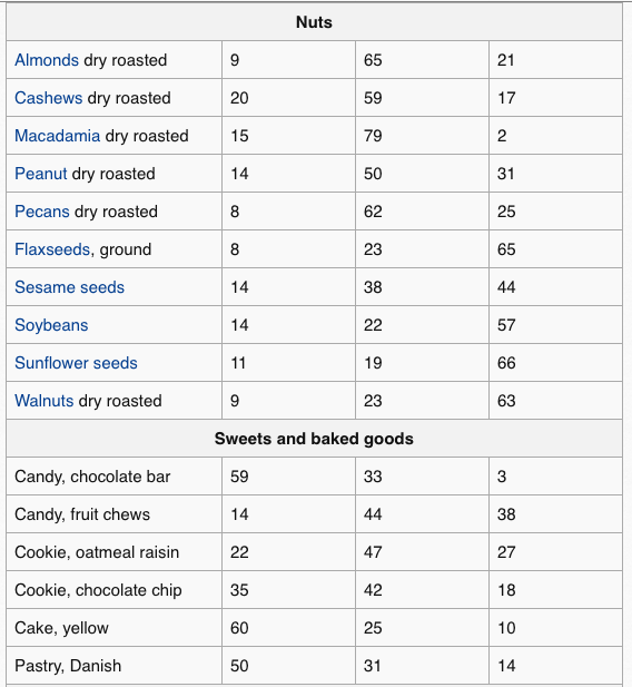Within each food there are specific saturated fat ratios comprising its total saturated fat load. Here’s a chart of a few common ones: