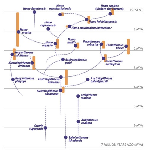 Australopithecus –> Homo Habilis –> Homo Ergaster –> Homo Antecessor –> Heidelbergensis –> Homo Sapiens