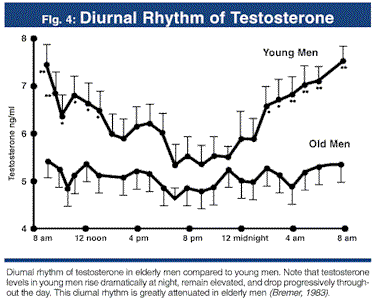 *Noticeable is the difference between young and old men on the testosterone daily rhythm. Although this is yet to be fully explained it is a widely observed difference and is often used to discern how “youthful” a man might still be. Men who feel substantially vital in the morning and considerably less so at night are representing a normal and youthful male hormonal pattern.