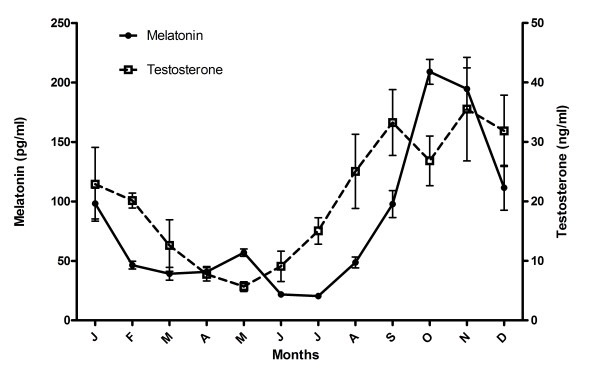 While daily hormone rhythms are an important part of understanding male behavior and function on a day to day basis, an equally important cycle to be aware of is annual/yearly/seasonal testosterone changes. On an annual basis, testosterone reaches a peak in late fall and a low in spring. It looks like this: