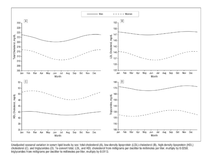For the people interested in a bit more detail, read the entire article. For the people who just need the basic concept, know this: There is some seasonal variation and it is seen a bit more in women and high cholesterol populations, although lower cholesterol populations see more percentage/relative change. If you get your cholesterol tested in the winter it might be anywhere from a bit higher to considerably higher than if tested in the summer and it’s likely to be a bit higher in the middle of the day than in the morning or evening. This is helpful for general knowledge since many people are “borderline” high cholesterol (it may simply be a winter peak) and is even more important for retesting. Make sure your variables of time and season are controlled if you’re looking for if a change has taken place.