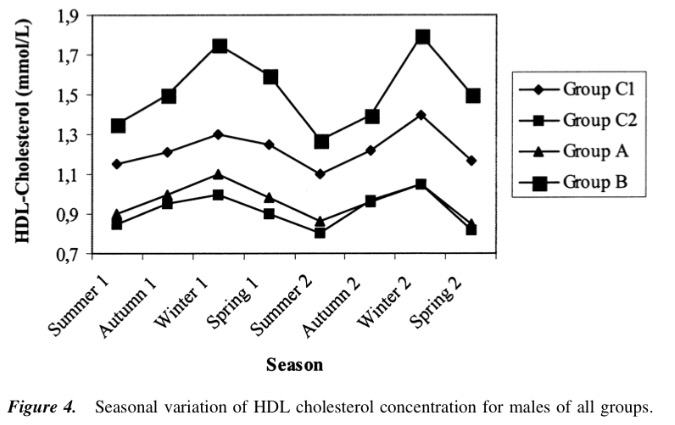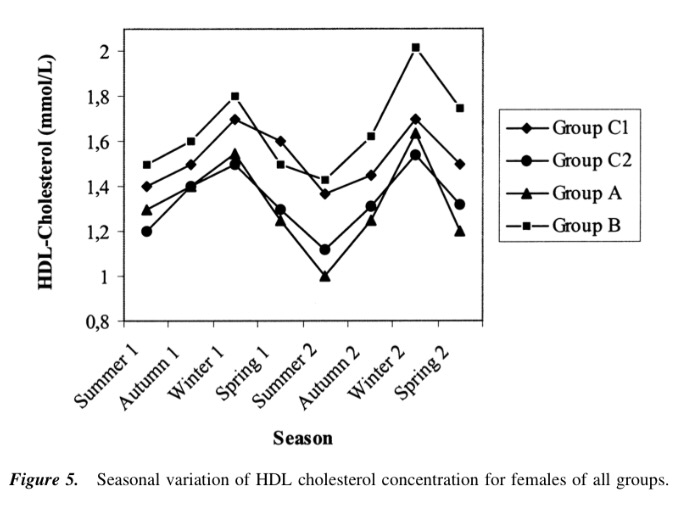 Looking at the men, the 3 non exercise groups are virtually identical in blood cholesterol change, regardless of if they were high or low baseline cholesterol. That means the older control group and vegetarians both saw the same absolute change seasonally (about 20 points), despite the fact the vegetarians cholesterol was considerably lower (about 50 points). This means that the vegetarian group actually experienced the biggest relative/percentage change from season to season of all non exercisers. The male athletes experienced the biggest change both absolute (40 points) and relative (20%). This is likely explained from the following graph: