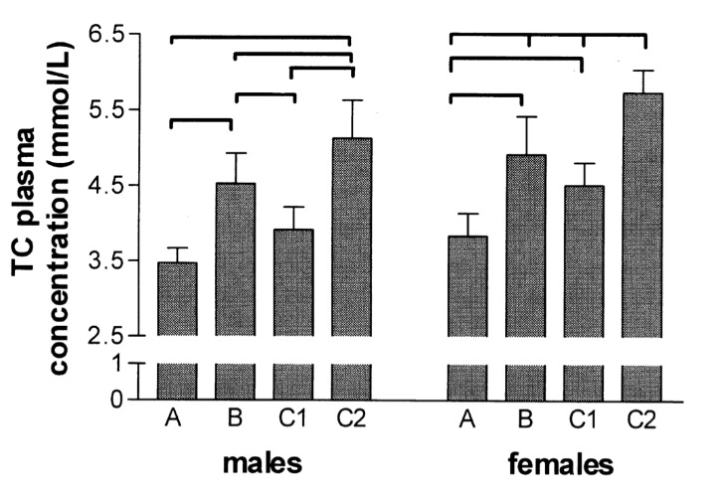 The basic cholesterol data, using the universal mmol/L measurement is below. American testing uses mg/dl so I did some basic conversion for ease of comparison. A total cholesterol of 5.5 mmol/L translates to about 215 mg/dl, 4.5 equals 175, 3.5 equals 135. Every 1.0 is about 40 points.