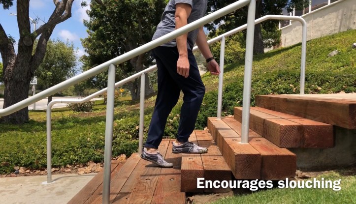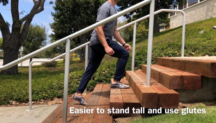 This allows you to turn each flight of stairs into a mini workout and posture tool for you instead of a chore and bad biomechanics reinforcer. Walking up the stairs incorrectly unfortunately keeps our weak muscles weak (glutes) and the dominant ones (hip flexors and quads) dominant so the more often we can do it better the stronger and more efficient we will get, all while balancing our body out a bit.